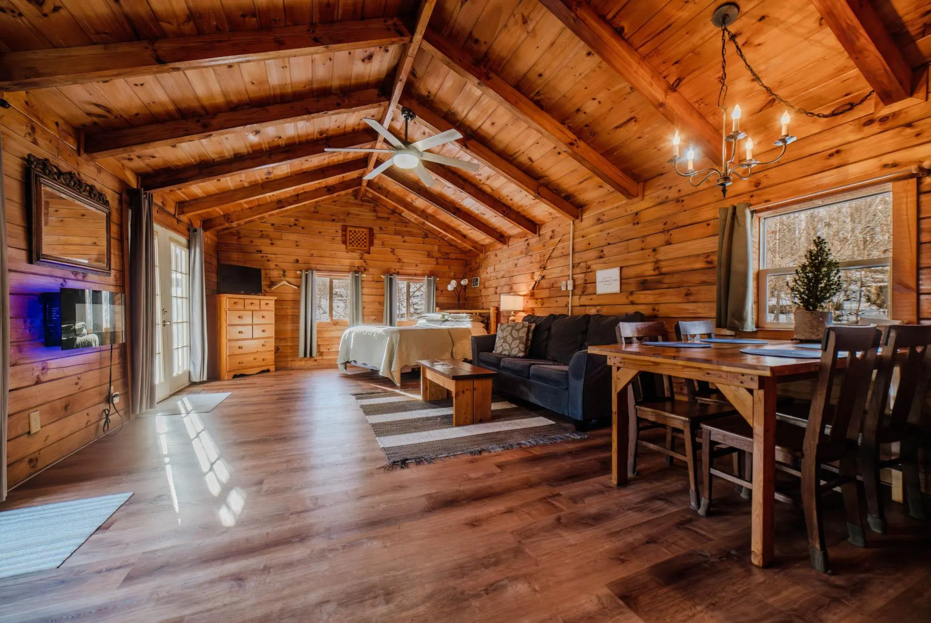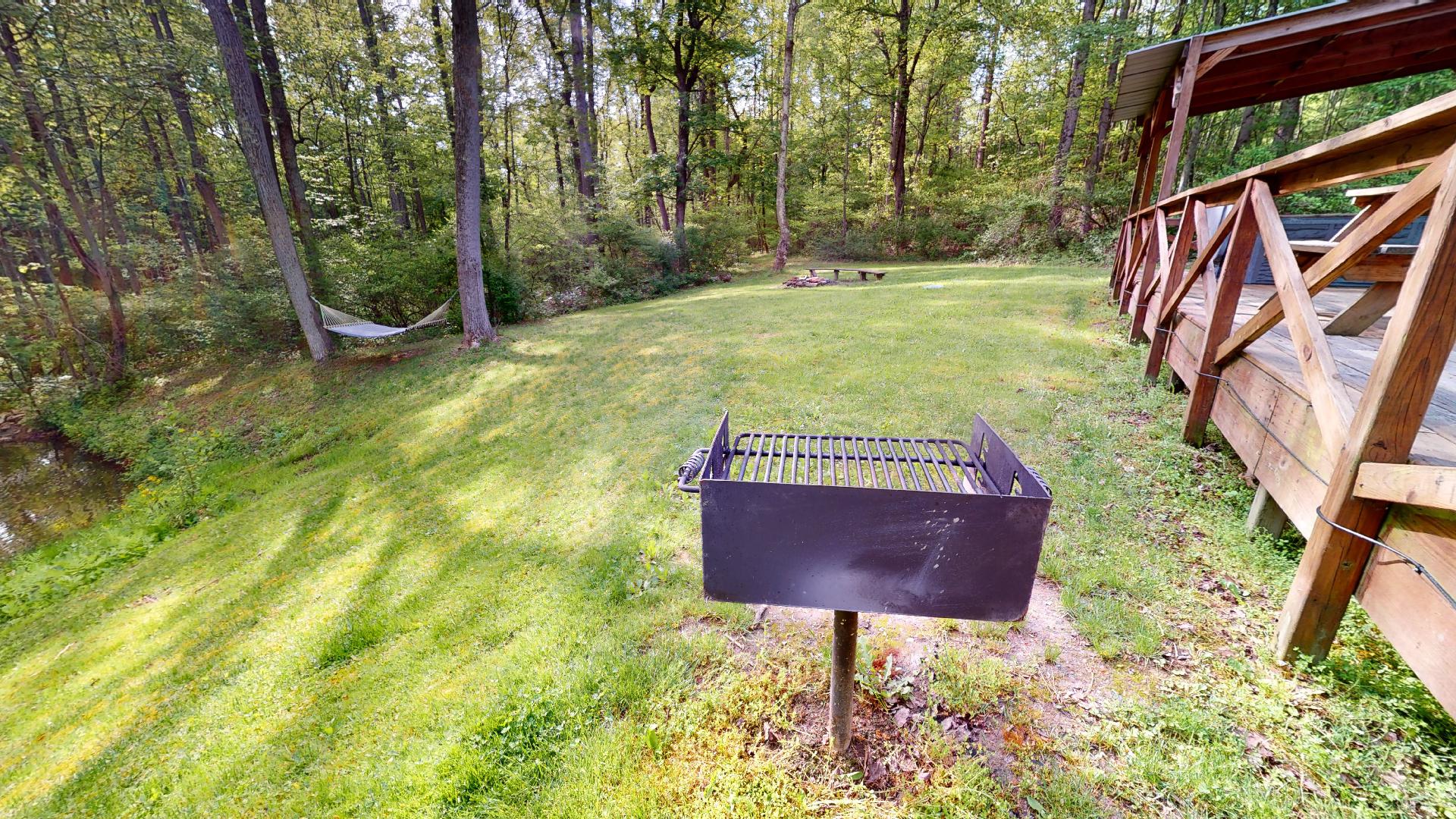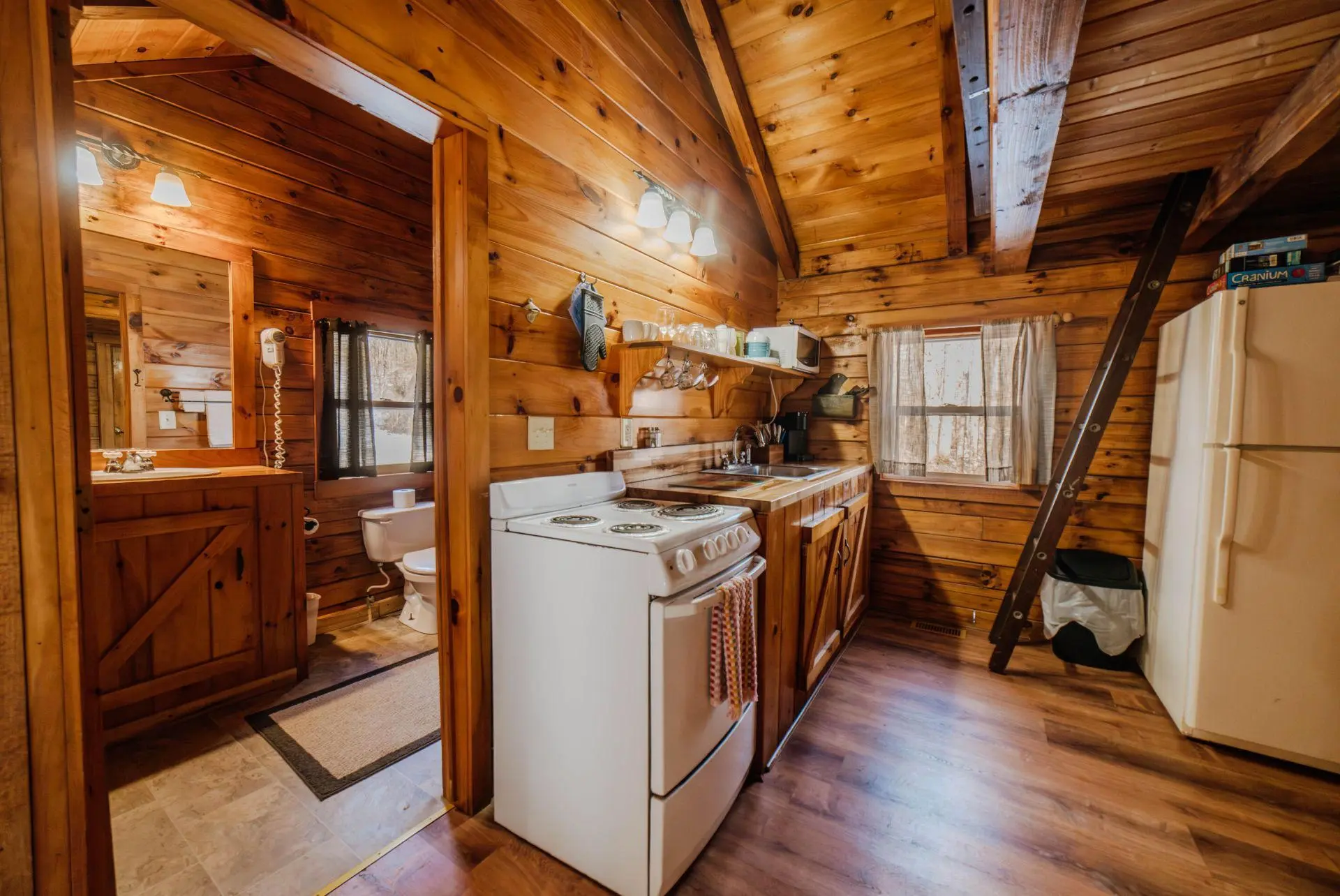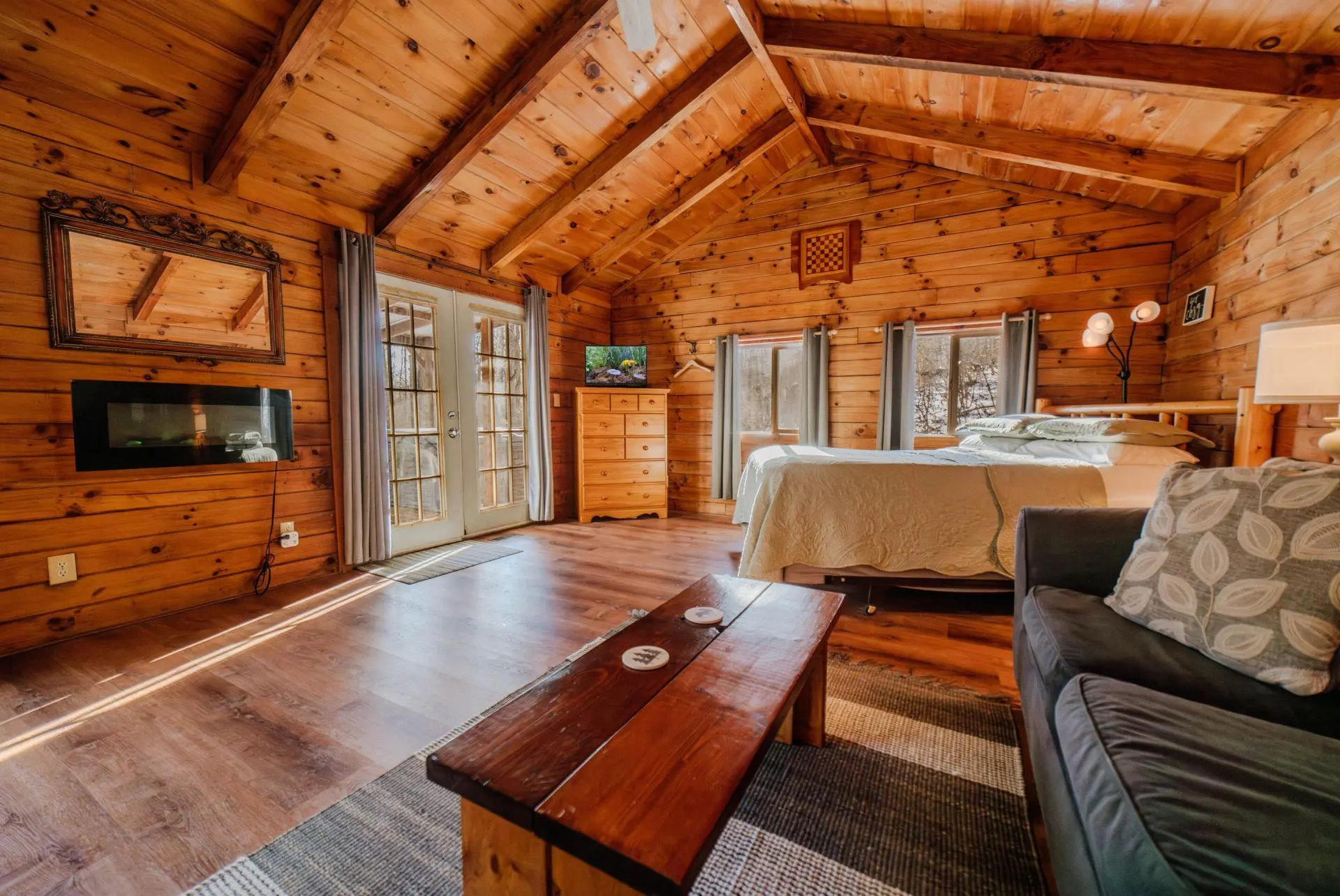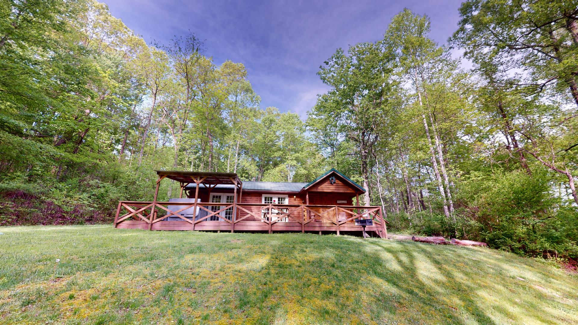 Comfort Three is the perfect family cabin and accommodates five people. This cabin is situated on ten acres with a small catch and release fishing pond and large grassy yard for families to enjoy recreation time. The kids can snuggle under the lantern with a book in the sleeping loft while the adults take the bed in this large open space cabin. This cabin is perfect for families or couples. It features a fully equipped kitchen, Roku Smart TV, electric fireplace, and hot tub on a covered back deck.