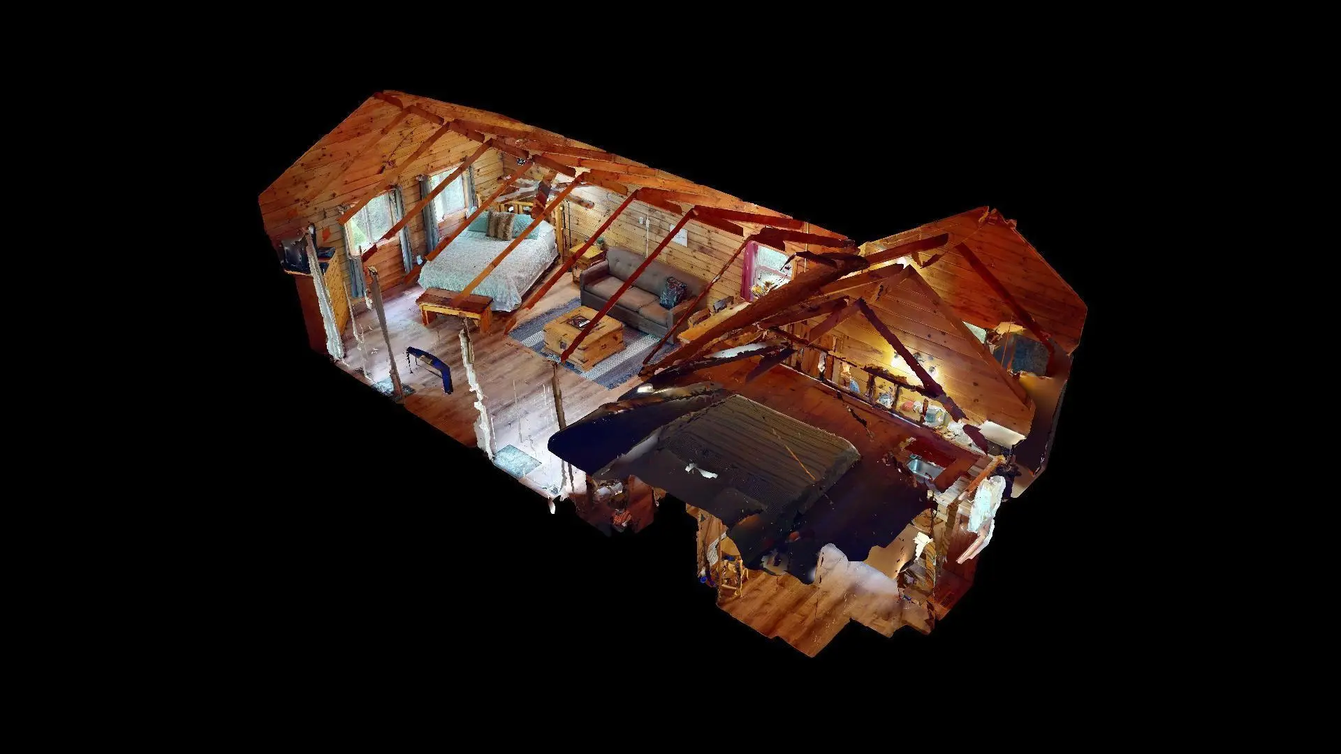 - Queen Size Bed & Queen Sleeper Sofa and full size mattress in low ceiling sleeping loft