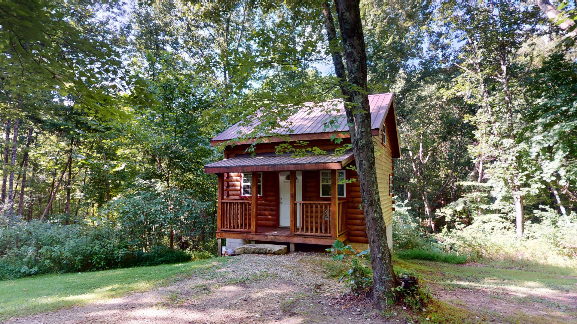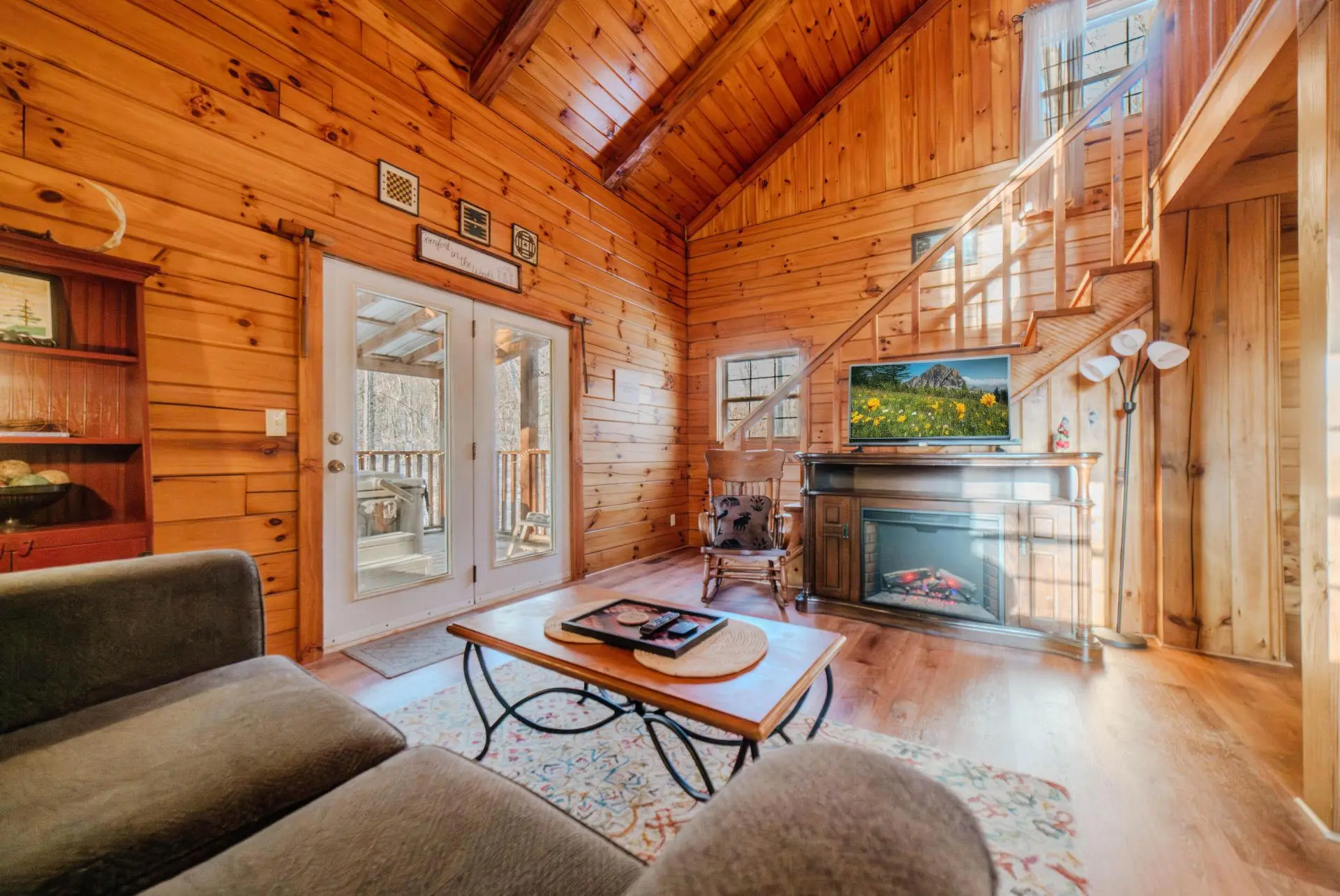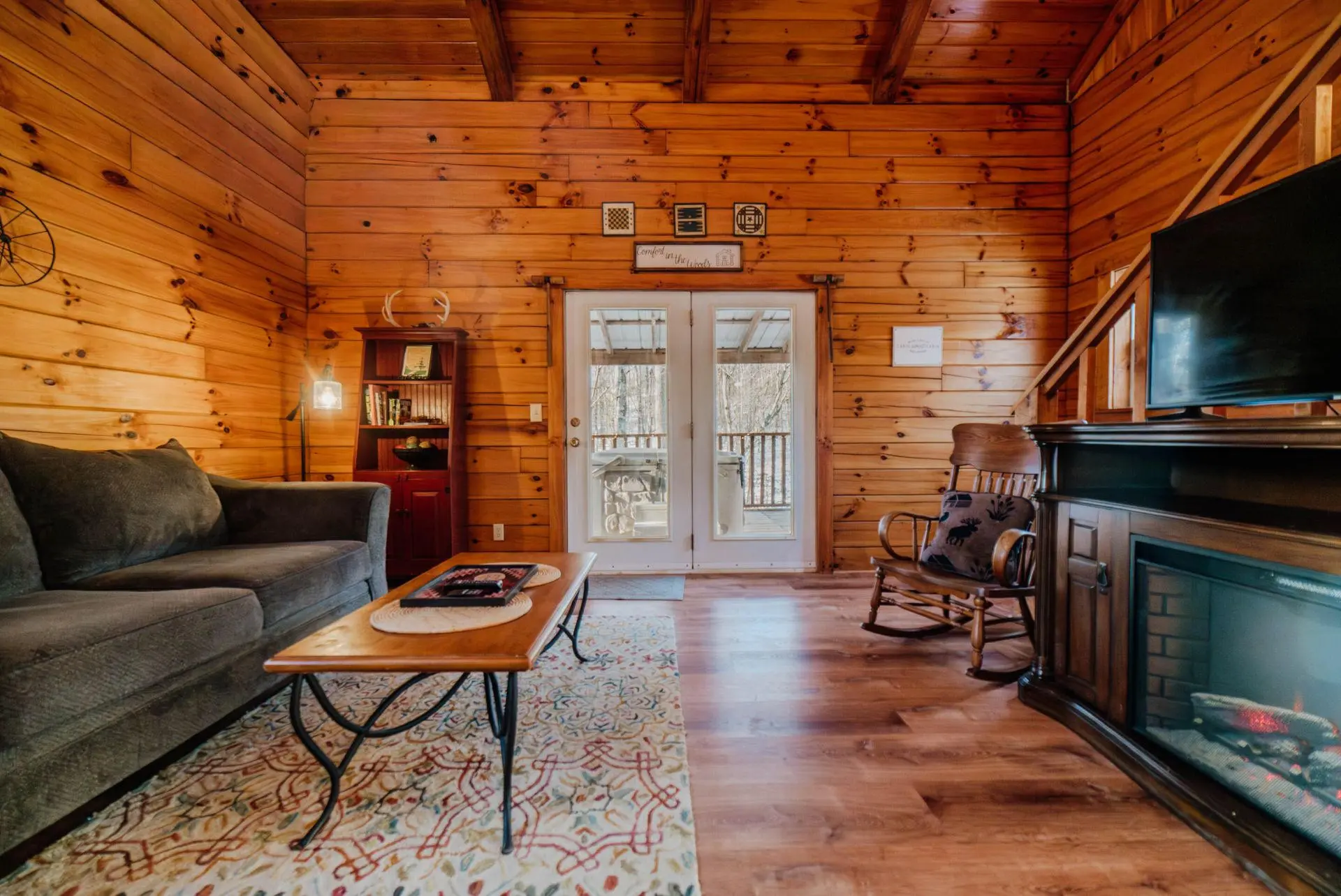 Comfort Two is a romantic couples cabin. It sleeps 2. This beautifully built log cabin is perfect to snuggle and reconnect with your special someone. It is secluded on ten wooded acres and fully furnished with a large loft bedroom overlooking an open family room area. It features a fully equipped kitchen, Roku Smart TV, electric fireplace, and hot tub on a covered back deck.